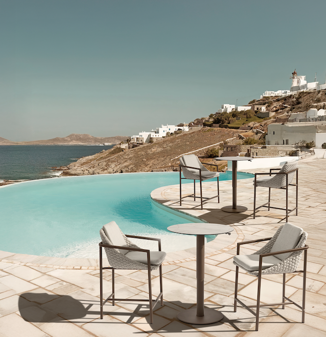 Colors: Aluminum frame with a dark bronze finish; textile, cushions, and rope in a sand-colored tone.