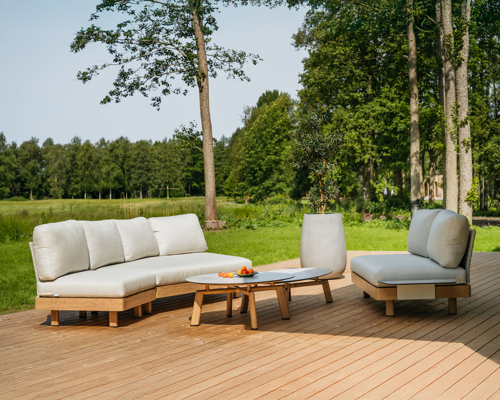 Lounge sērijas komplektu veido trīsvietīgs dīvāns ar labo pusi, divvietīgs dīvāns, āra dīvāna pagarinājums, apaļš un ovāls kafijas galdiņš, kā arī palīggalds.